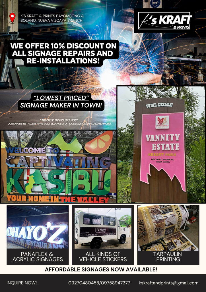 K’s Kraft & Prints: Your #1 choice for quality signages and the lowest-price sublimation shirts in Nueva Vizcaya!